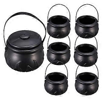 7 Pcs Novelty Candy Kettles with Lid Halloween Black Kettles Candy Holder Witches Cauldron with Handle (1pc Size L without Fire Pattern, 6pcs Size S w