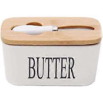 Butter Dish with Knife, Porcelain Butter Keeper with Bamboo Lid Perfect for 2 Sticks of Butter