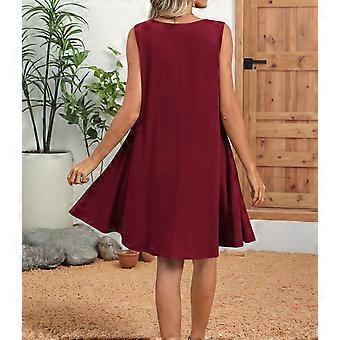 Women'S Summer Solid Color Round Neck Hollow Pleated Sleeveless Dress with Pockets Wine Red M