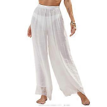 Women Cotton Linen Wide Leg Palazzo Pajamas Trousers Lace Patchwork See Through Cover Up Pants High Waist Mesh Bikini Bottom Beach Bathing Suit