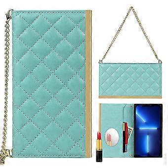Supporting Stand Phone Case Grid Texture Phone Bag Leather Hand Bag with Makeup Mirror for iPhone 13 6.1 inch